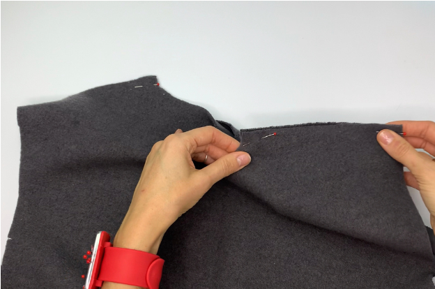 Pin the pocket piece to the Front matching the notches, Right sides together. Stitch as shown.