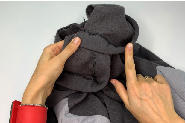 Pin the Hood into the neckline with the right sides together. Match the notches. Sew in place. Press.