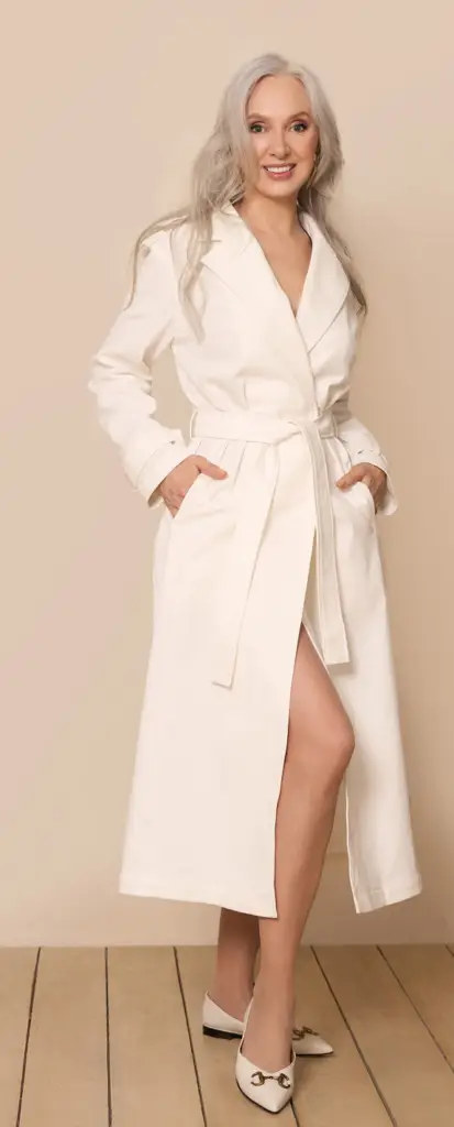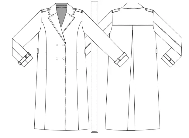Double-breasted medium volume trench coat with turn-down collar. It features pockets in the raised seams of the front. The back has a fold in the center and a flap. The sleeves are two-seam, with a sleeve strap at the bottom. There are shoulder straps on the shoulder seams. The trench coat is completed with a removable belt.