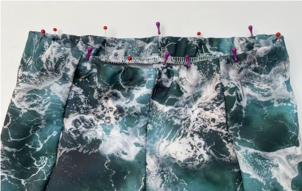 Fold the bottom hem of the trunks and pin. Make sure the gusset is pinned to the front. Sew in place using twin needle.