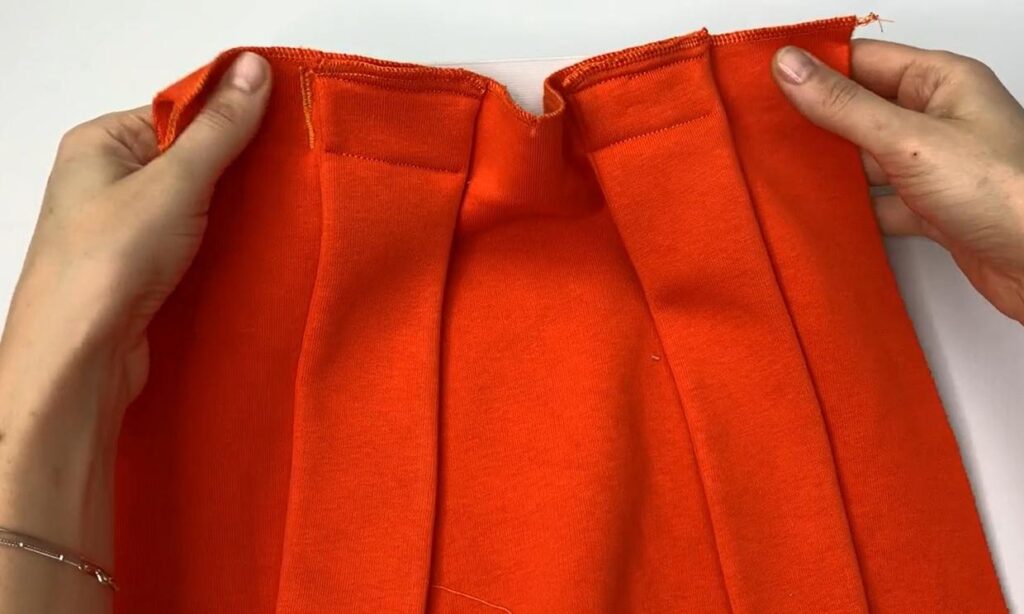 Form the casing. Pin the serged edge of the Back upper hem and stitch, stretching elastic a little bit.