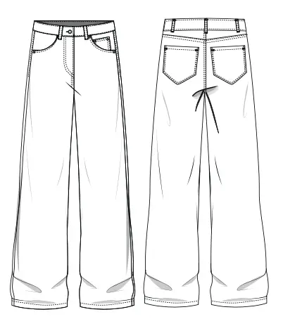 Wide-leg jeans with a mid-rise waistband. It features a metal zipper on the front, pockets in the side seams and one watch pocket. The back half has detachable yokes and patch pockets. Topstitching is made with contrasting threads.