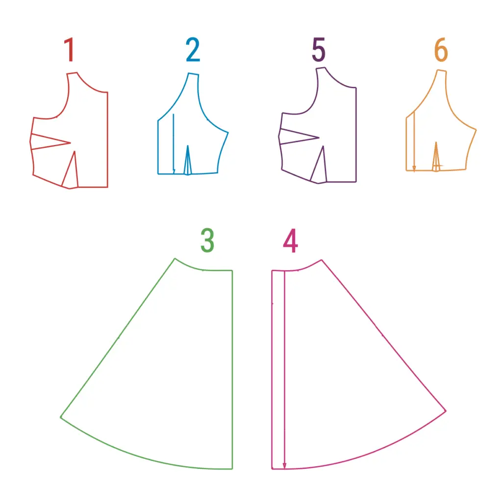 2. Sew the side seams of the front skirt (3) and back (4), placing the pieces right sides inside. Overlock seam allowances and press to the back.