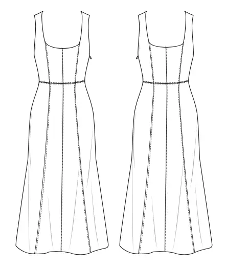 The sun dress features straps, calf-length, elongated towards the bottom, seam at the waist. Front and back have cut-off sides, central seams and topstitching along these seams. The side seam has an invisible zipper. At the bottom of the dress you can make a hand-made fringe.