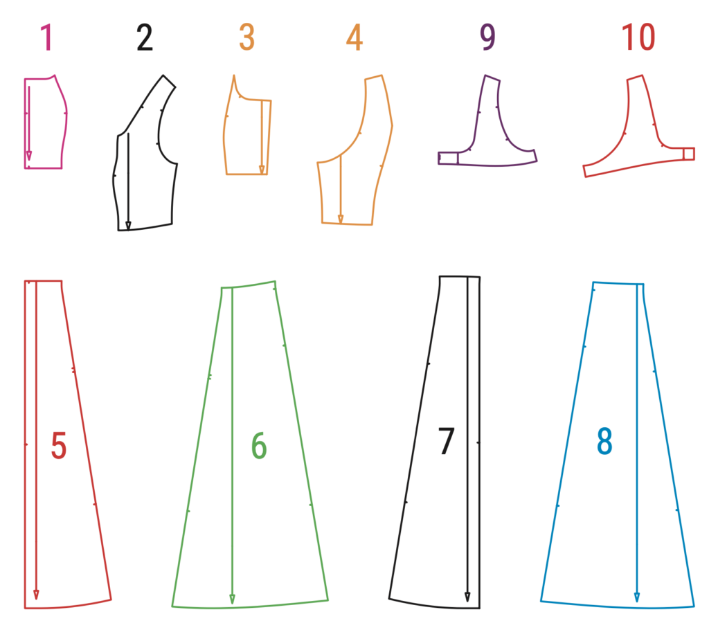 1. Fold right sides together and stitch the central parts of the front bodice (1) with the sides of the front bodice (2), as well as along the middle seam. Overlock them.