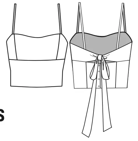 The top features straps, waist length, raised seams along the front. The back has a decorative bow tie at the top and a fastening with buttons at the bottom. The top is lined with main fabric.