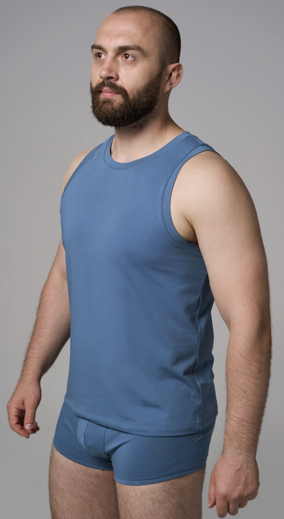 A basic men’s tight-fitting tank top, with armholes and neckline finished with binding. Suitable both as an underlayer for a shirt and as a standalone piece for summer or athletic outfits.