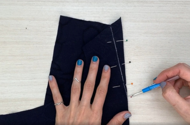 Attach the sleeve to the armhole right sides together, matching the notches. Pin and stitch on a sewing machine. Overlock the allowances and press onto the sleeve.