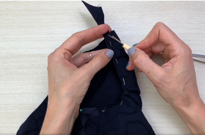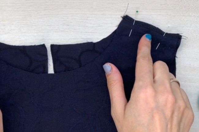 Fold the loose edge of the bias tape up and around the allowances of the back neckline. Pin and stitch it. Stitch on the right side into the seam.