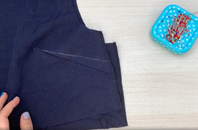 Stitch from the top edge of the skirt to the pocket entry mark, install a bartack. Next, sew the pocket pieces together to the side edges of the skirt, include the allowances, and then sew a stitch to the mark of the entrance to the pocket. Then stitch the side edges down to the edge of the skirt. Press the allowances open.