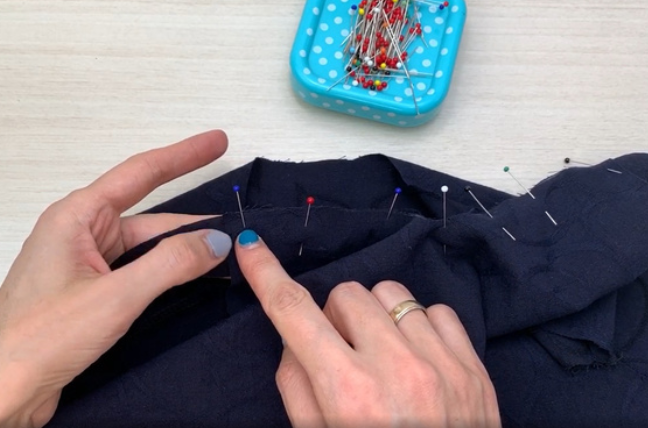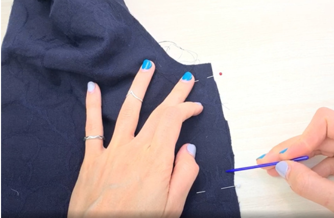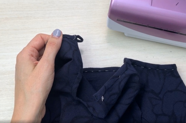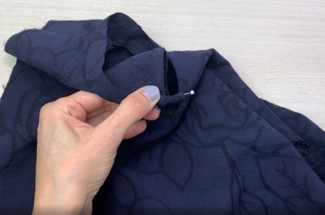 Pin the neckline edging (bias tape) to the garment along the line of the neck right sides together. Stitch 0.5 cm (0,2 in) from the edge.
