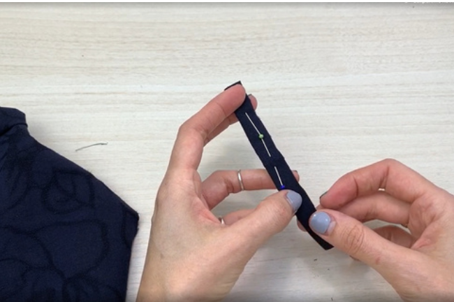 Fold the short edges of the bias tape, make a loop and pin to the edging.