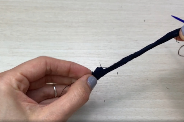 Prepare a loop for the button. Fold the piece in half along the long edge right sides together. Stitch it. Snip off the allowances to 0.3 cm (0.12 in).