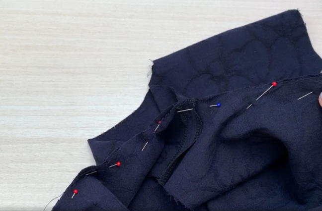 Pin the shoulder edges of the front and the back right sides together. Stitch it. Press the allowances open.