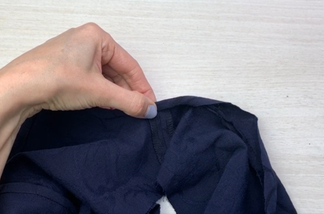 Pin the edging piece (bias tape) to the back neckline right sides together. Stitch 0,5 cm (0,2 in) from the edge. Press the allowances towards the bias tape.