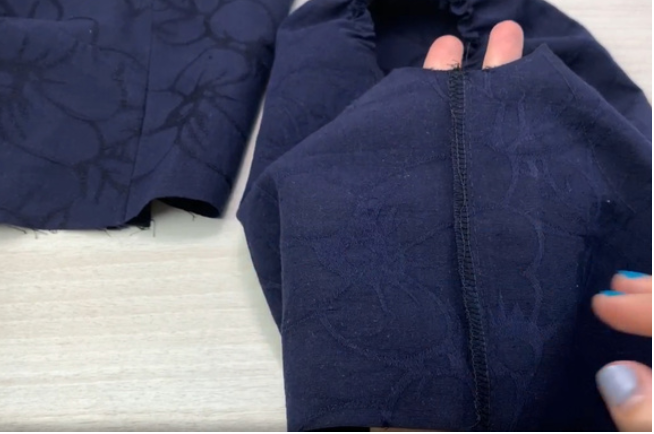Fold sleeve pieces in half along the side edges right sides together. Pin and stitch on a sewing machine. Overlock the allowances and press towards the back.