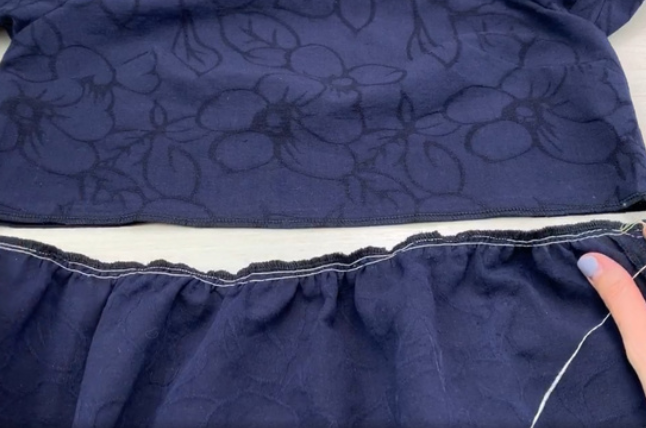 Along the upper edge, sew two parallel stitches and pleat the skirt. Overlock the edge.