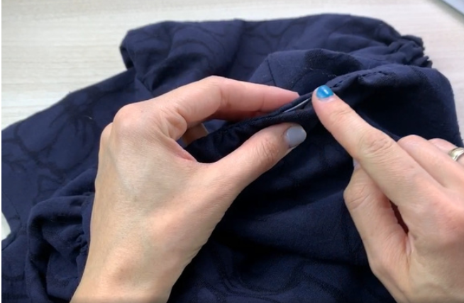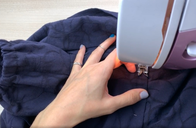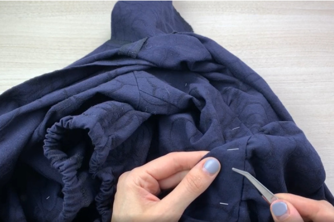 Overlock the bottom of the sleeve. Fold and press it. Stitch on a sewing machine, leaving an opening for the elastic.