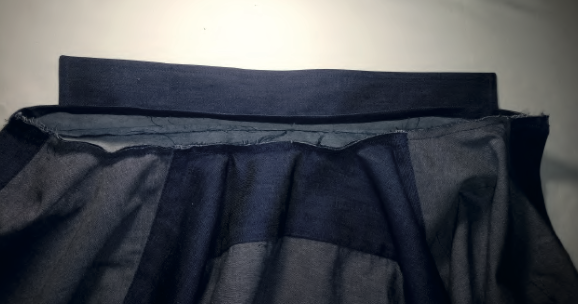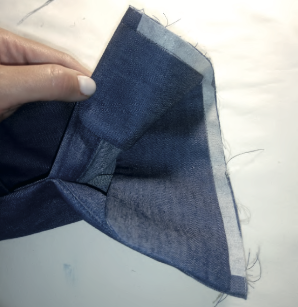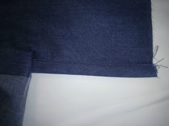 Serge the upper hem. Bend the upper hem wrong side up and stitch its corners at 1 cm (0,39″) seam allowances.