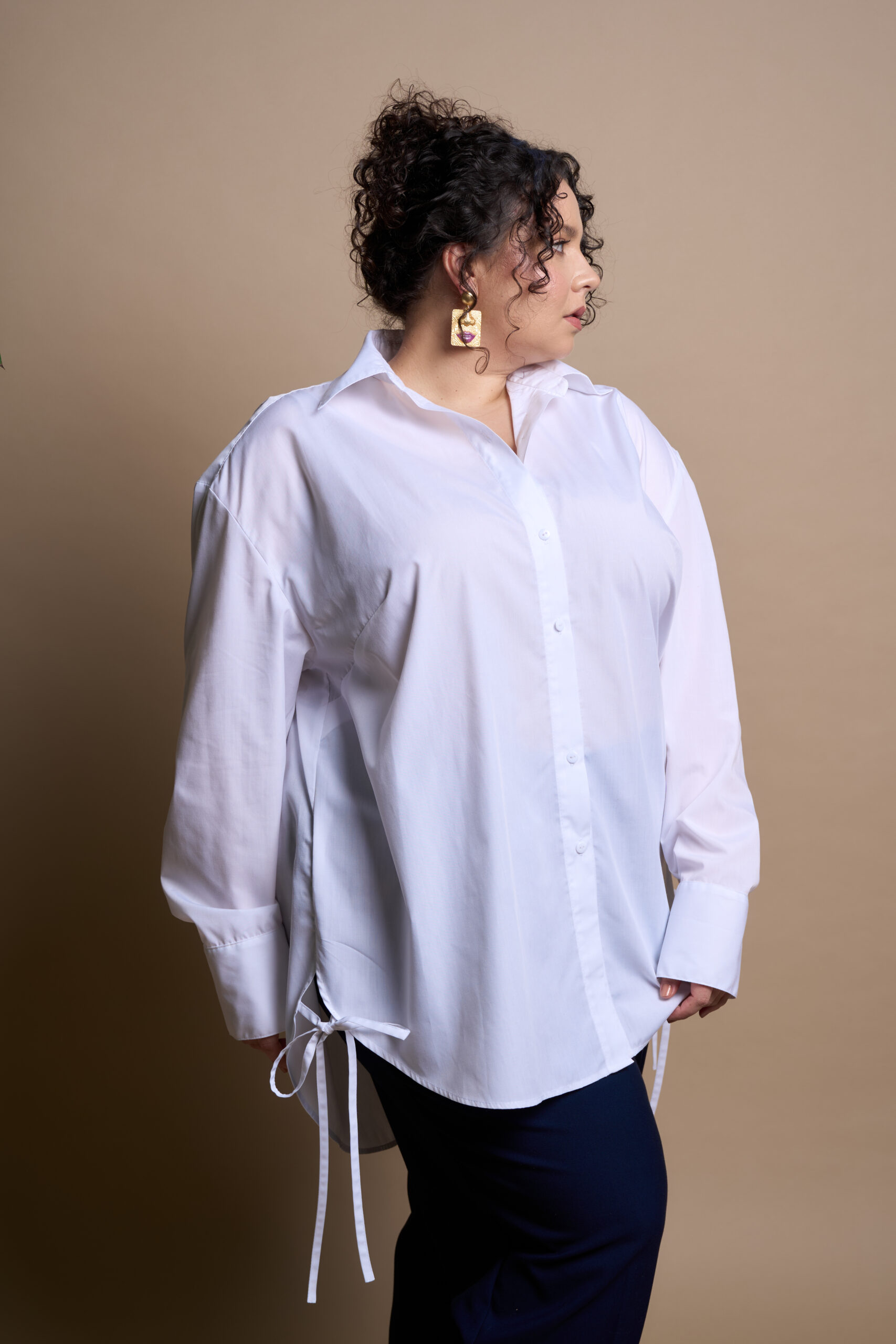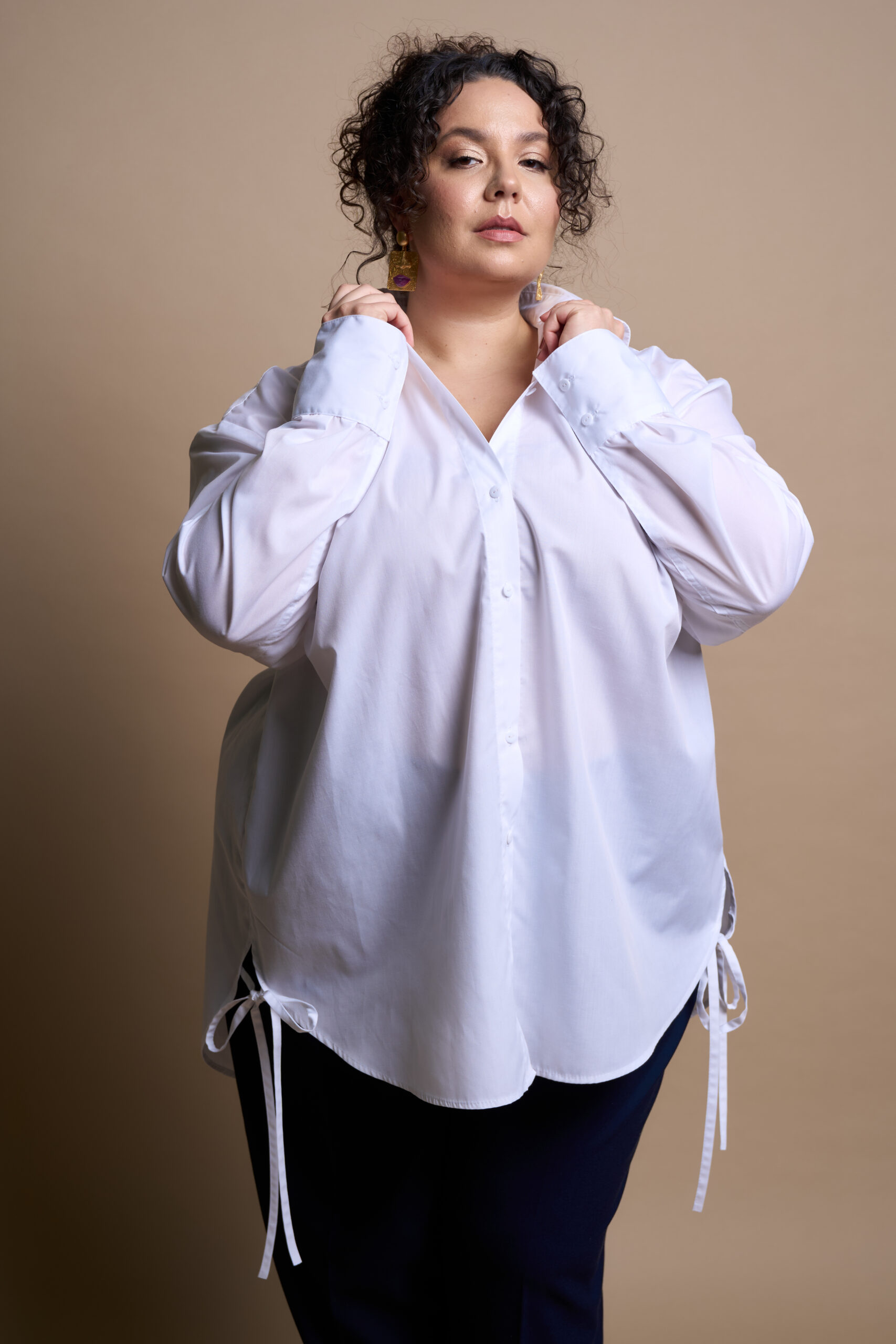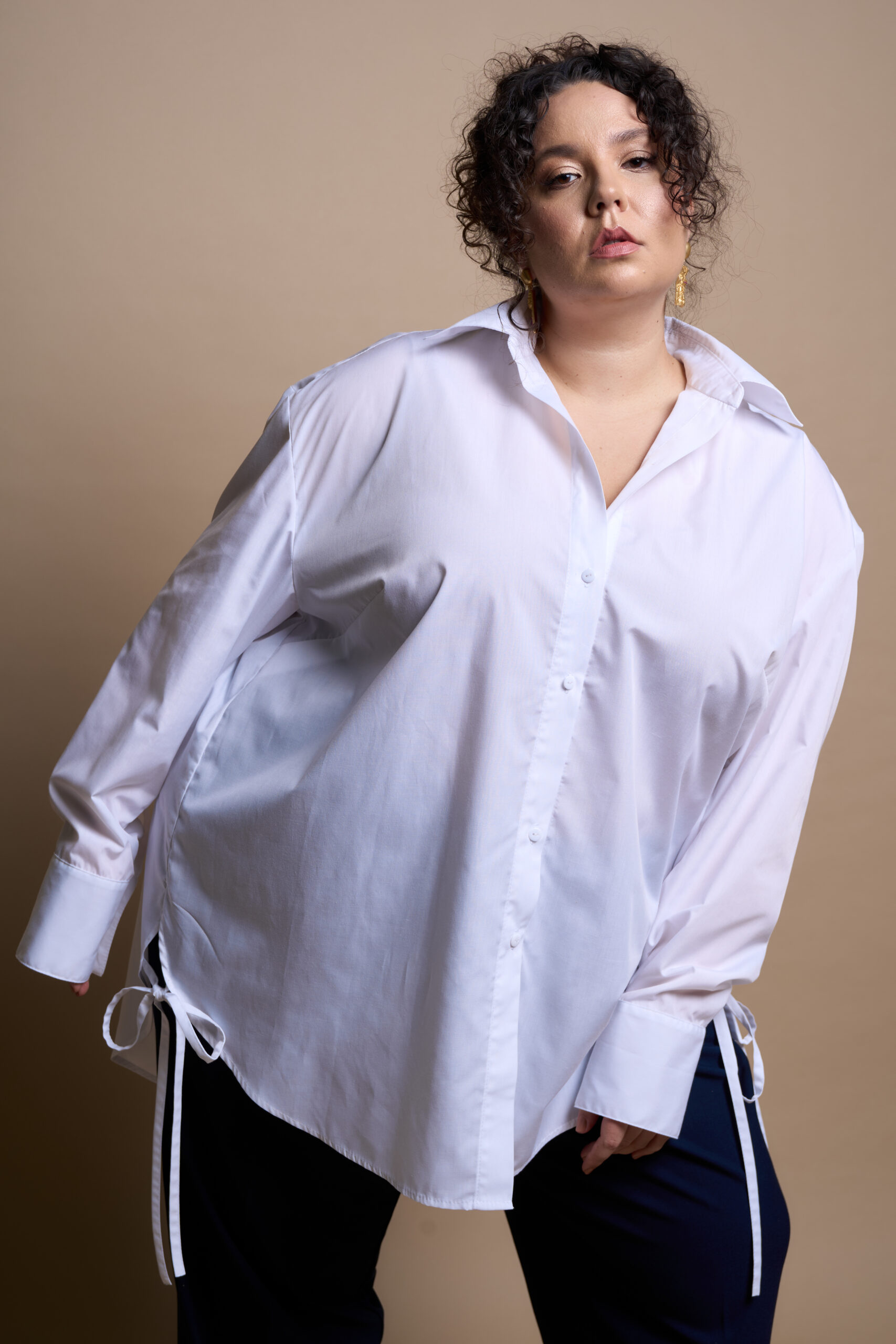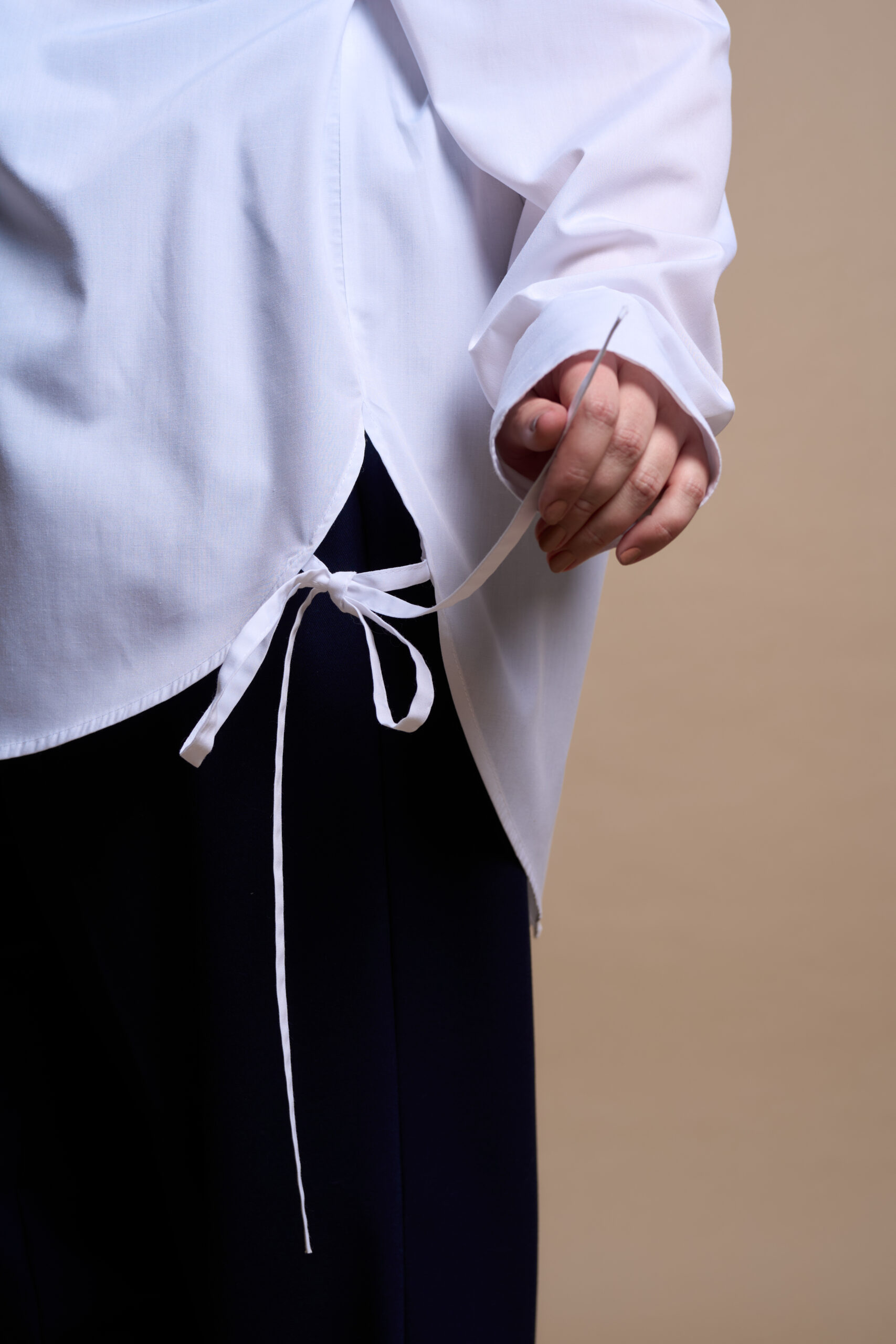 A straight-cut shirt with a central button and buttonhole fastening, a turn-down collar with a stand. The sleeves are long, two-piece, and finished with cuffs. The front features bust darts, and the side seams have decorative ties at the hem.