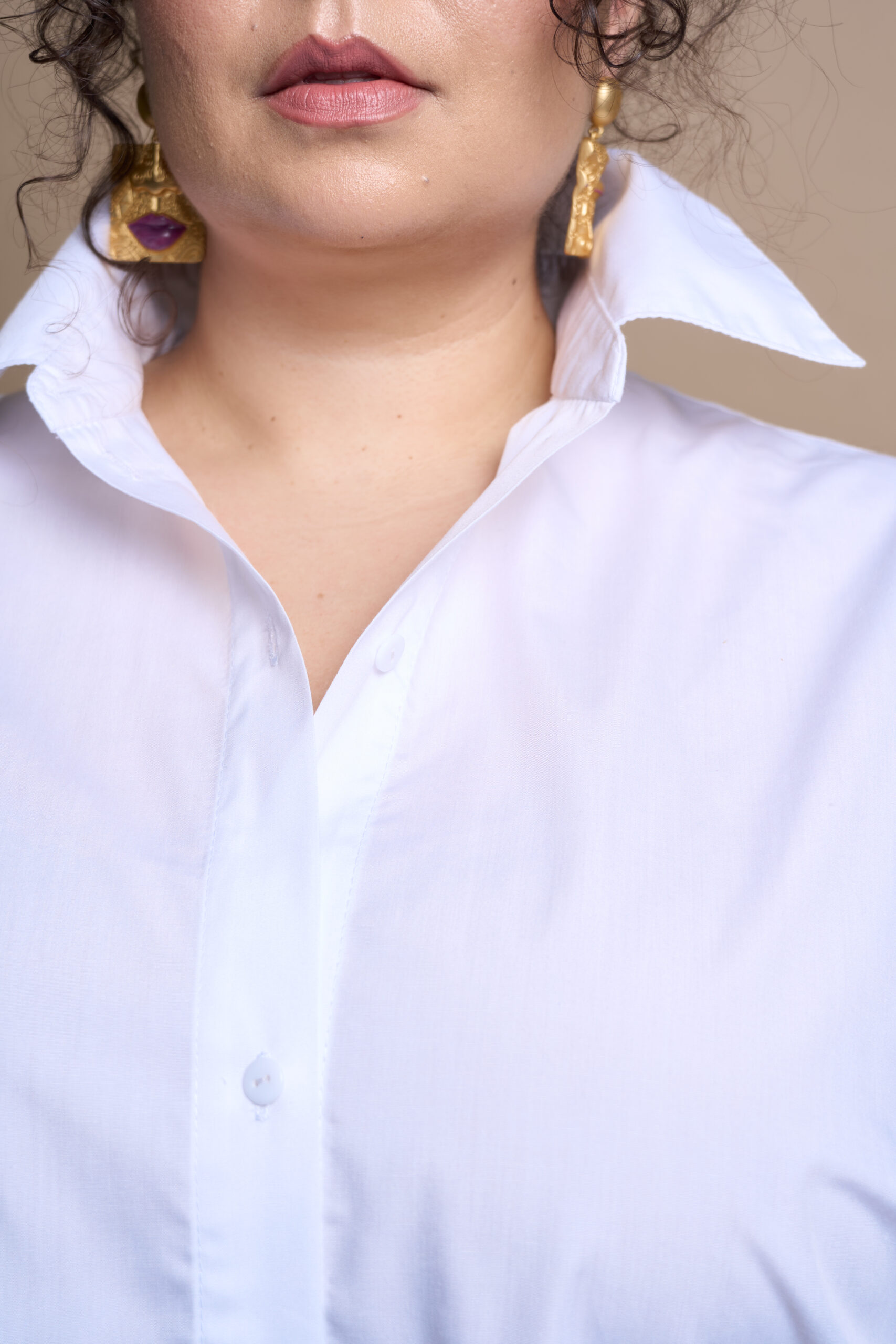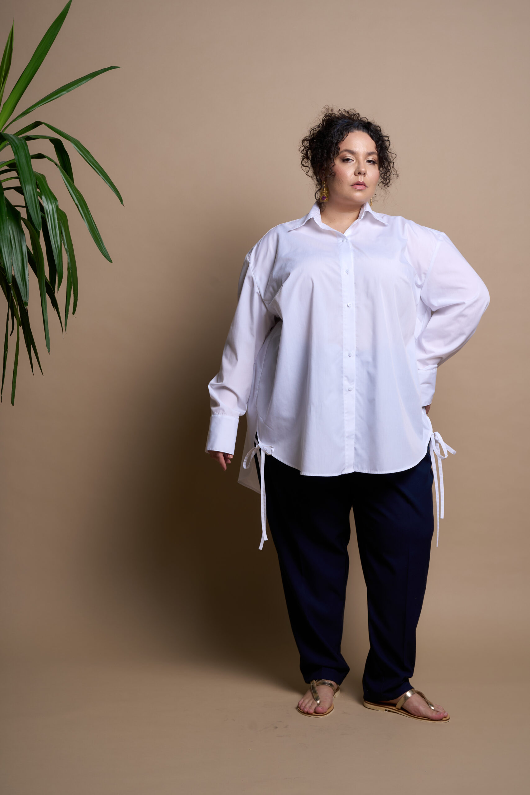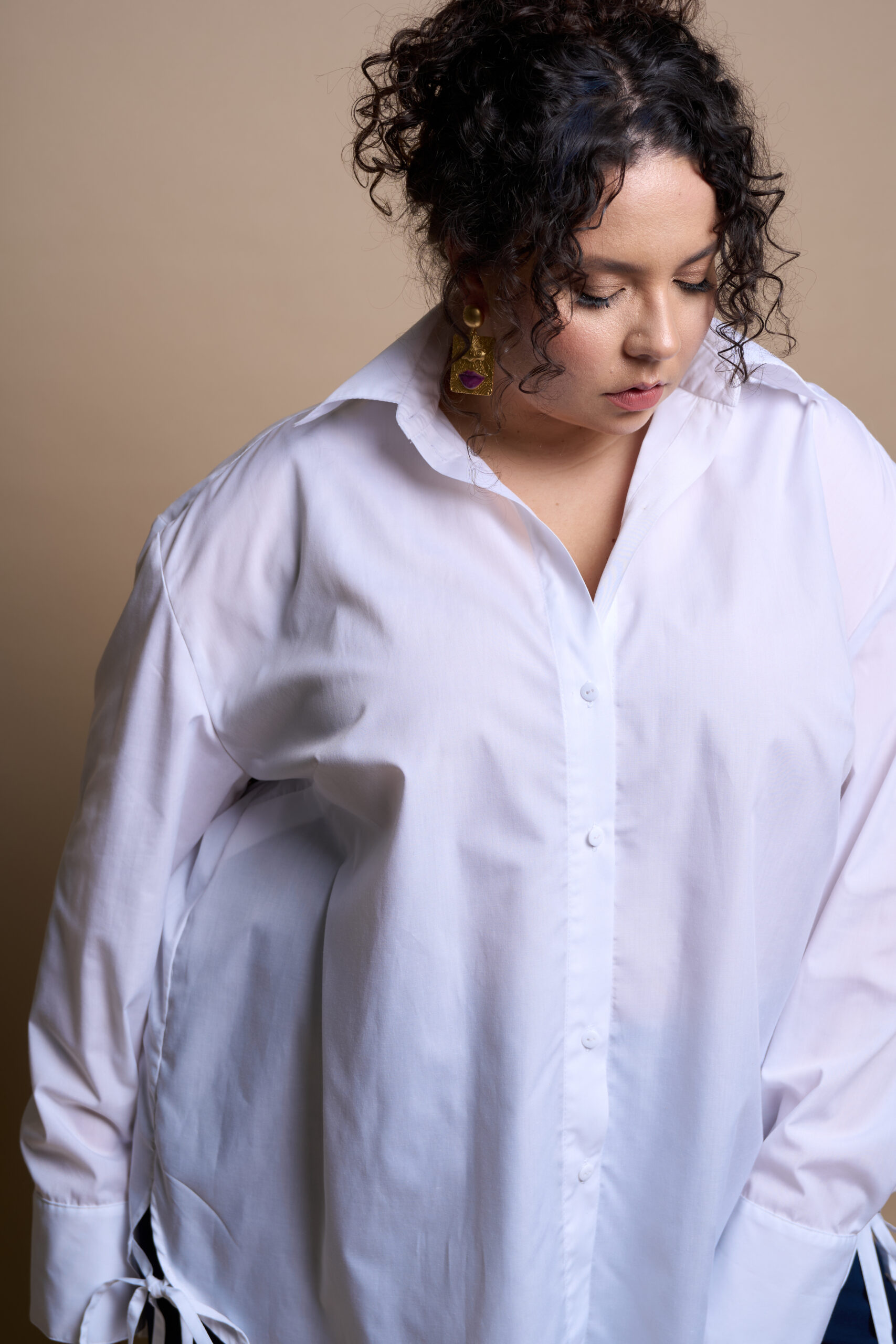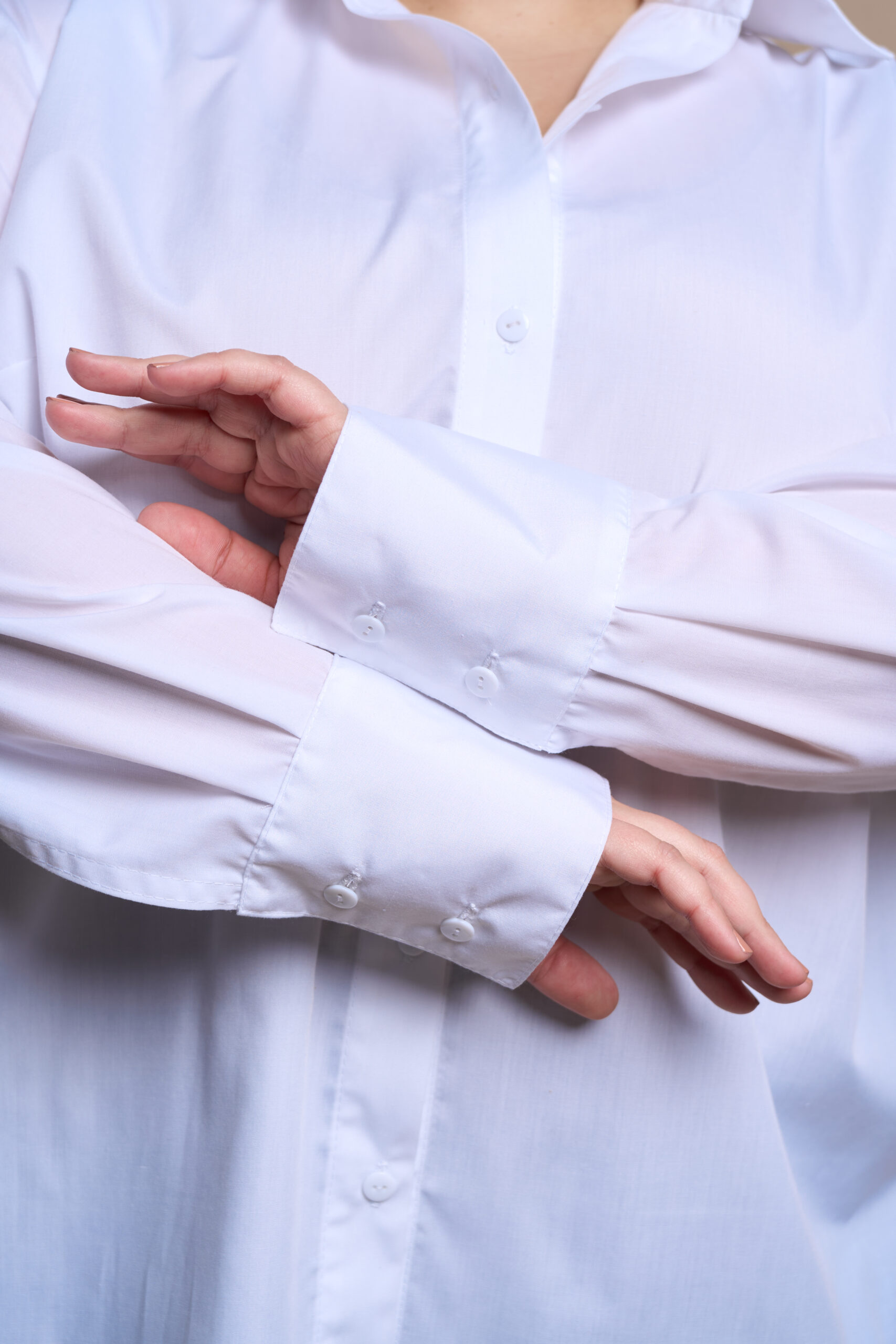 A straight-cut shirt with a central button and buttonhole fastening, a turn-down collar with a stand. The sleeves are long, two-piece, and finished with cuffs. The front features bust darts, and the side seams have decorative ties at the hem.