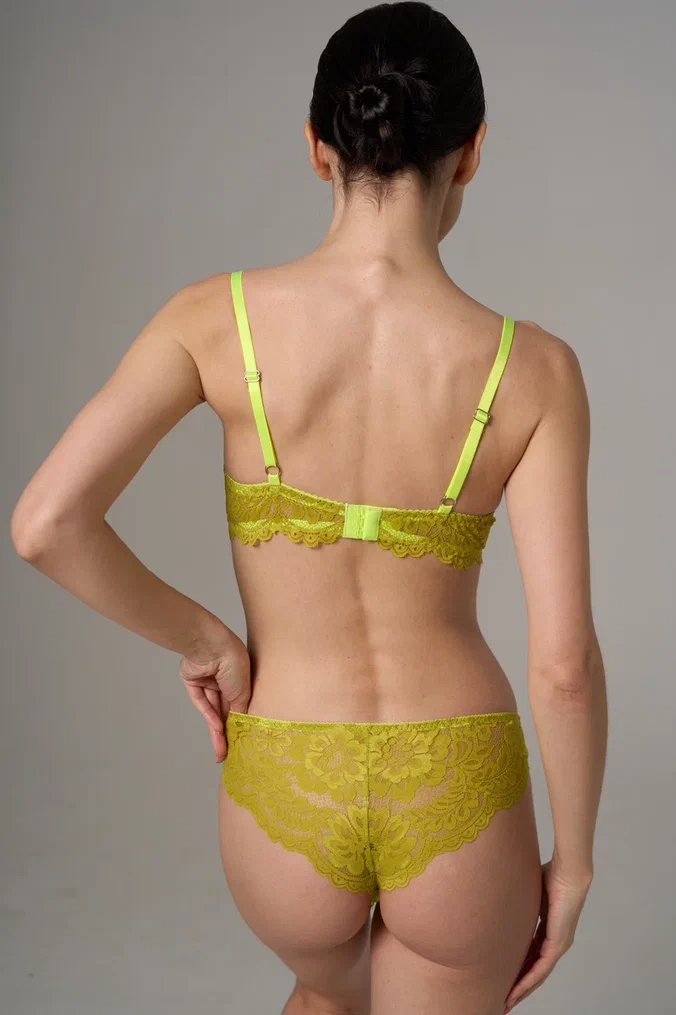 Lace padded bra with underwiring and straps, a wide bridge in the front, hook-and-eye fastening in the back.