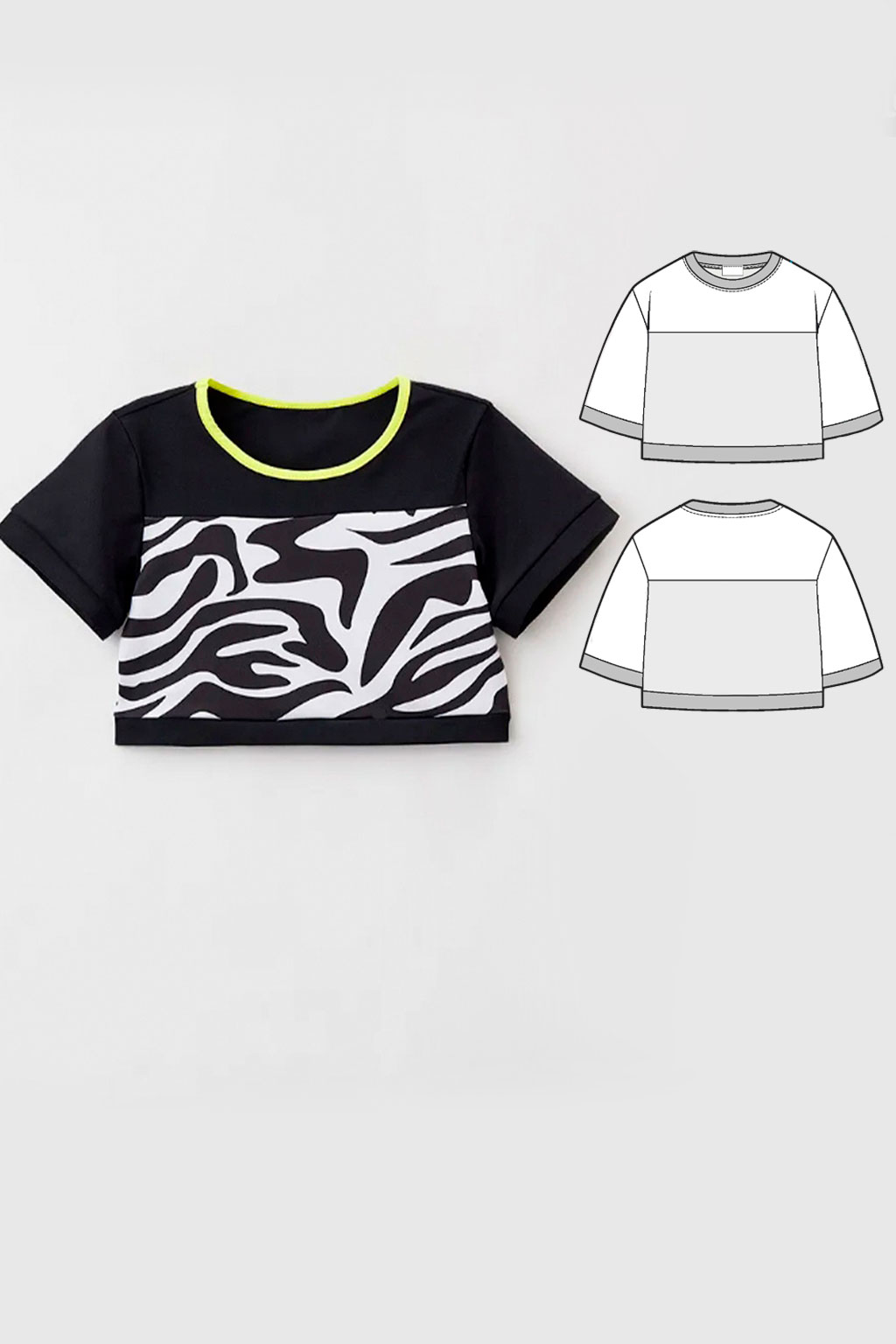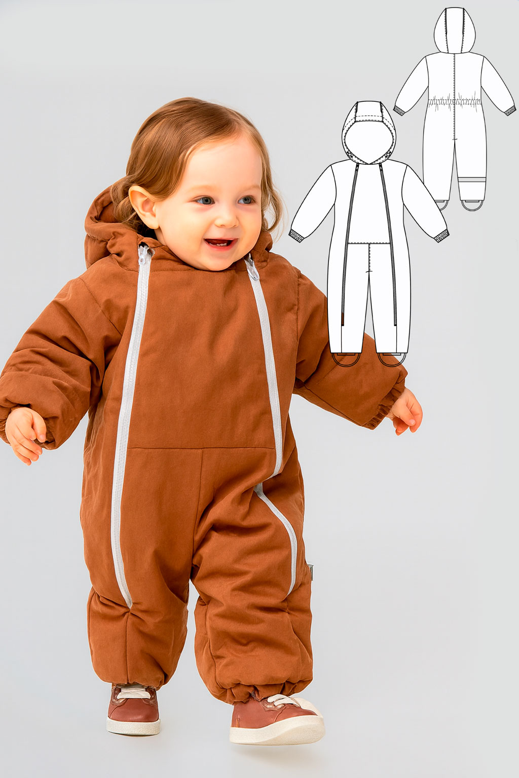 The set contains 3 formats of sewing patterns in pdf: A4 (210 x 297 mm), Letter (215,9 x 279,4 mm) and Plotter (A0 or 841 x 1189 мм), also a sewing guide and a children’s sweatshirt sewing instruction.