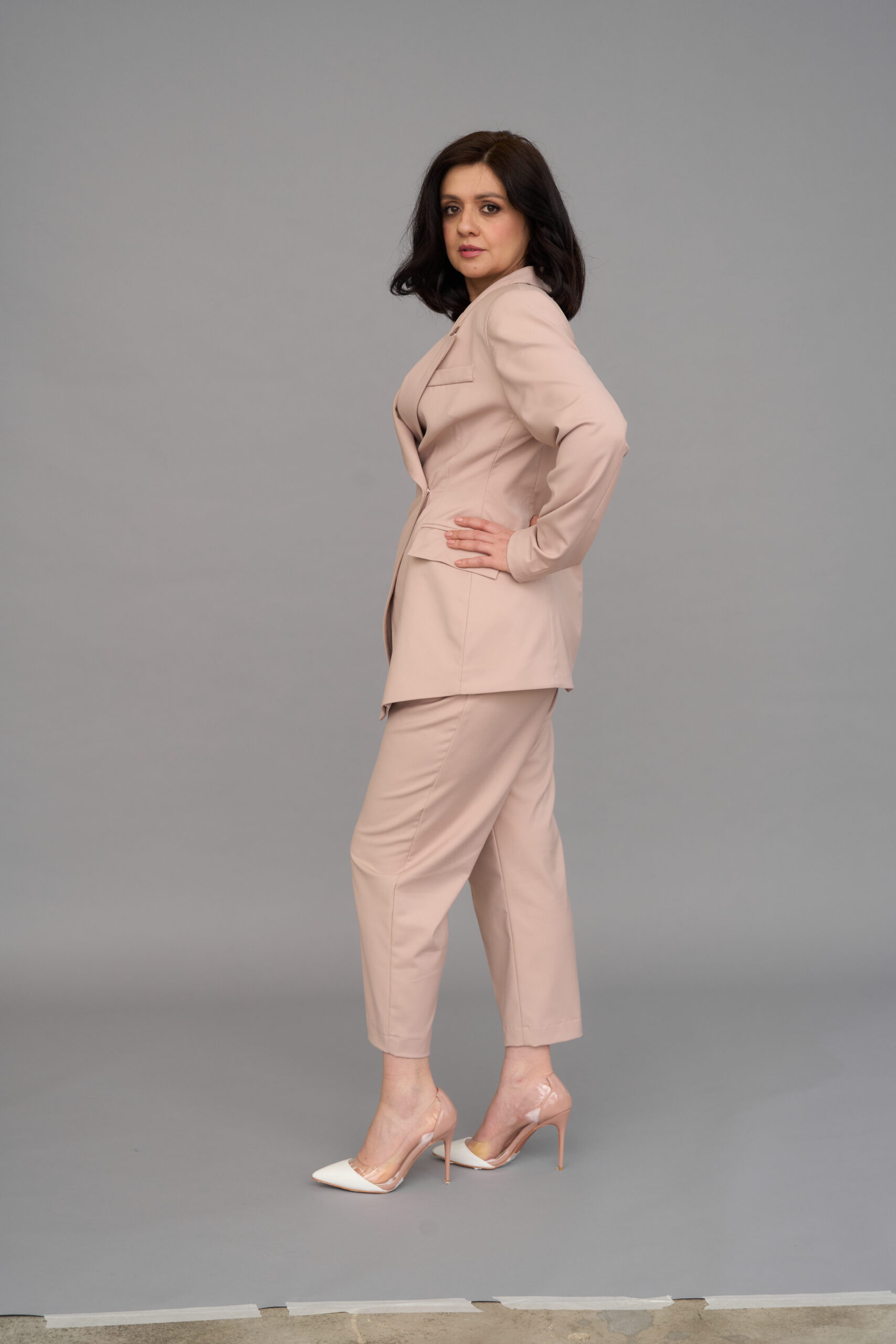 A fitted jacket with button fastening. The front has darts at the waist, with princess seams from the armhole to the bottom, with framed pockets and flaps. The back has a center seam.