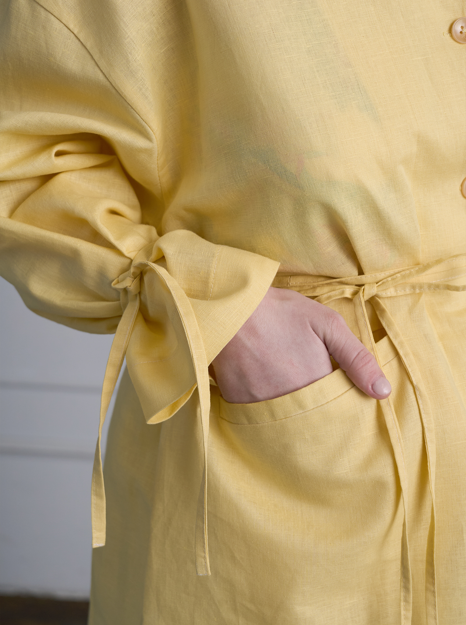 Light jacket, unlined, of straight silhouette, with snap fastening and stand-up collar. Welt pockets at the front. Decorative ties at the bottom of the sleeves.