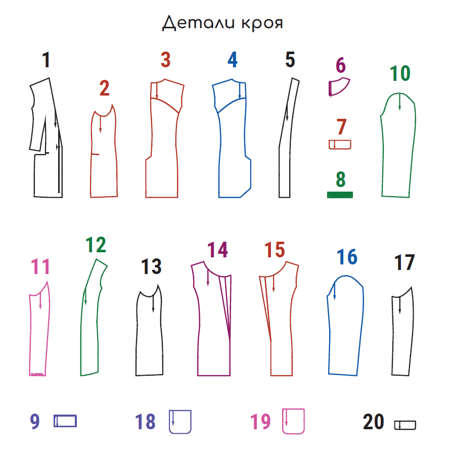 The set contains 3 formats of sewing patterns in pdf: A4 (210 x 297 mm), Letter (215,9 x 279,4 mm) and Plotter (A0 or 841 x 1189 мм), also a sewing guide and a the sewing instruction.