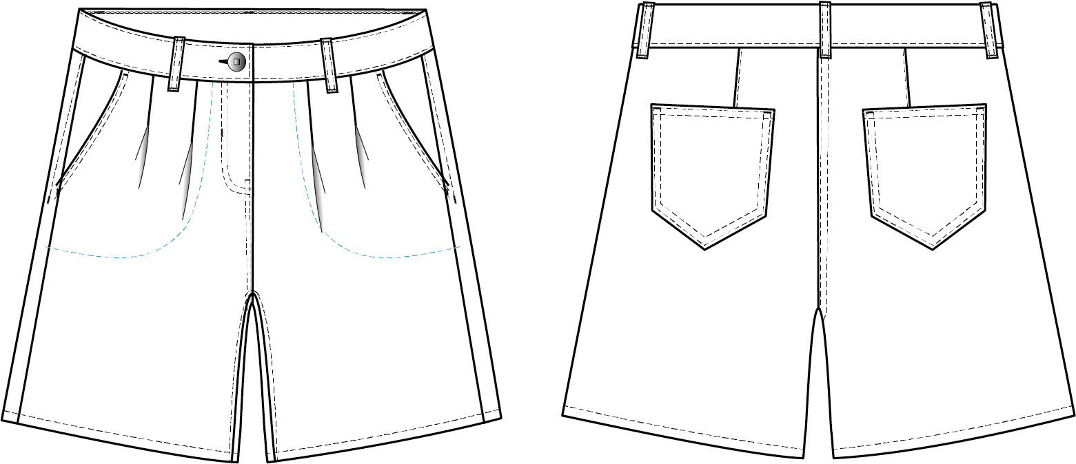 We offer you a pattern of denim shorts with a waistband. The front features a metal zipper closure, side seam pockets, and pleats from the waist. The back has patch pockets.
