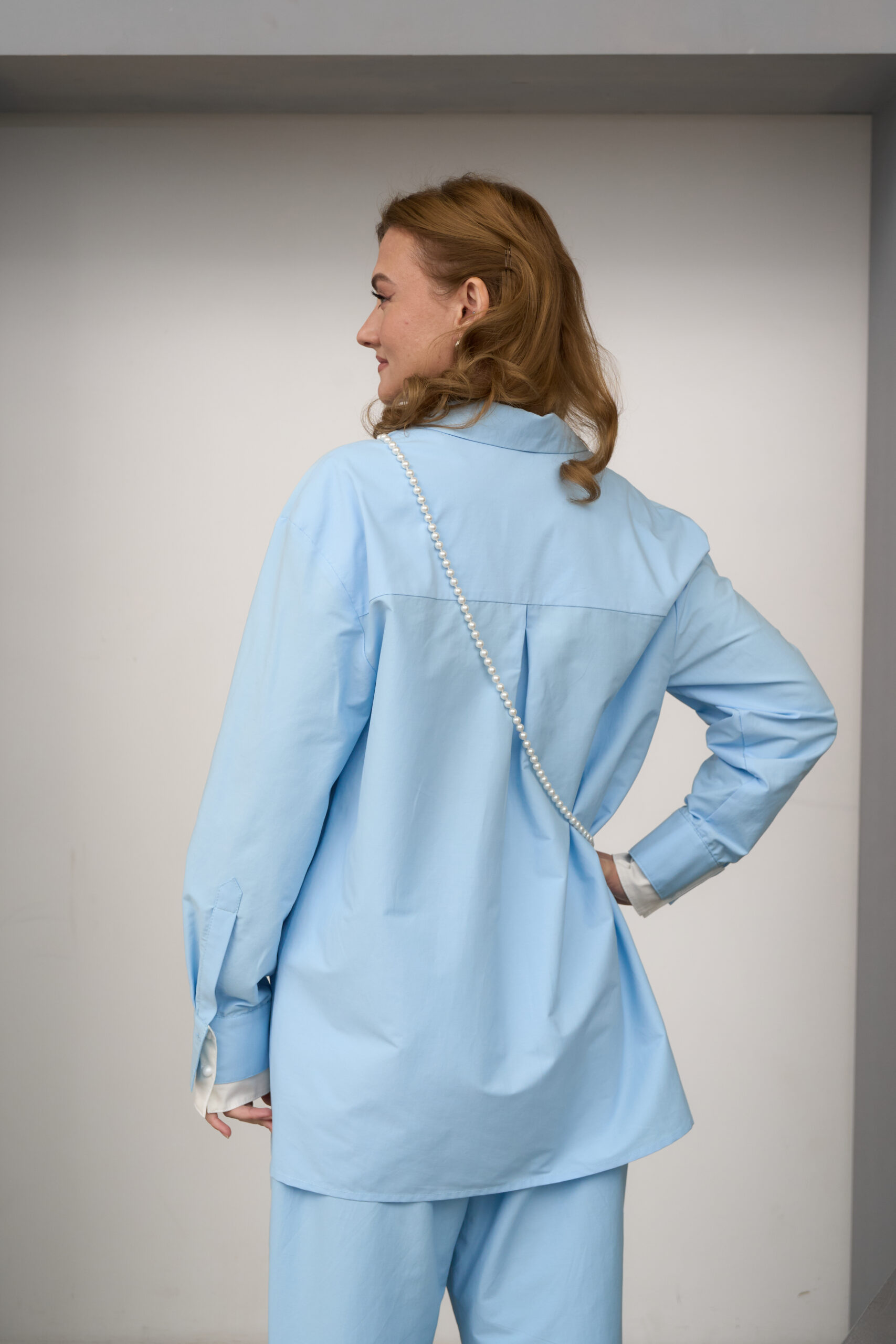A straight-cut shirt with a central button placket and a notched collar. The back features a double yoke with pleats. The sleeves are long, with double cuffs and a button closure.