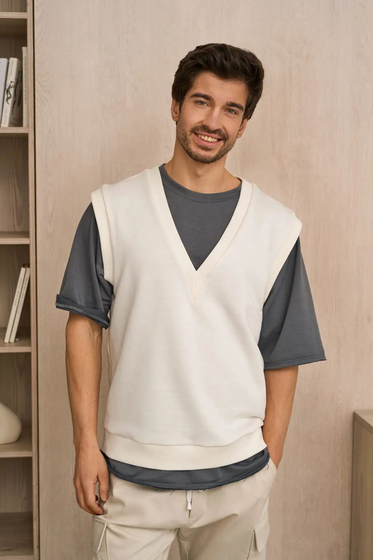 The Padua vest is a knit vest with bands along the neckline and armholes. The hem has a detachable waistband with a slight cinch.
