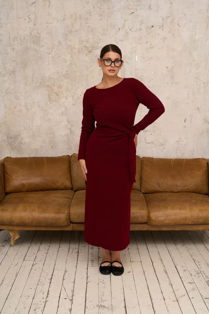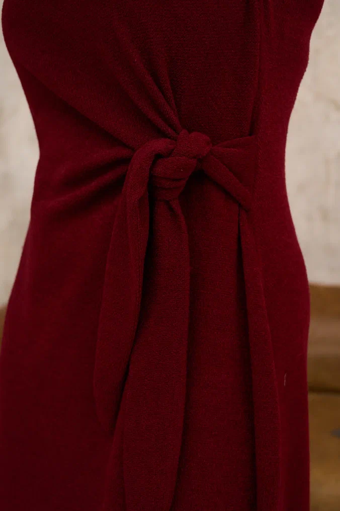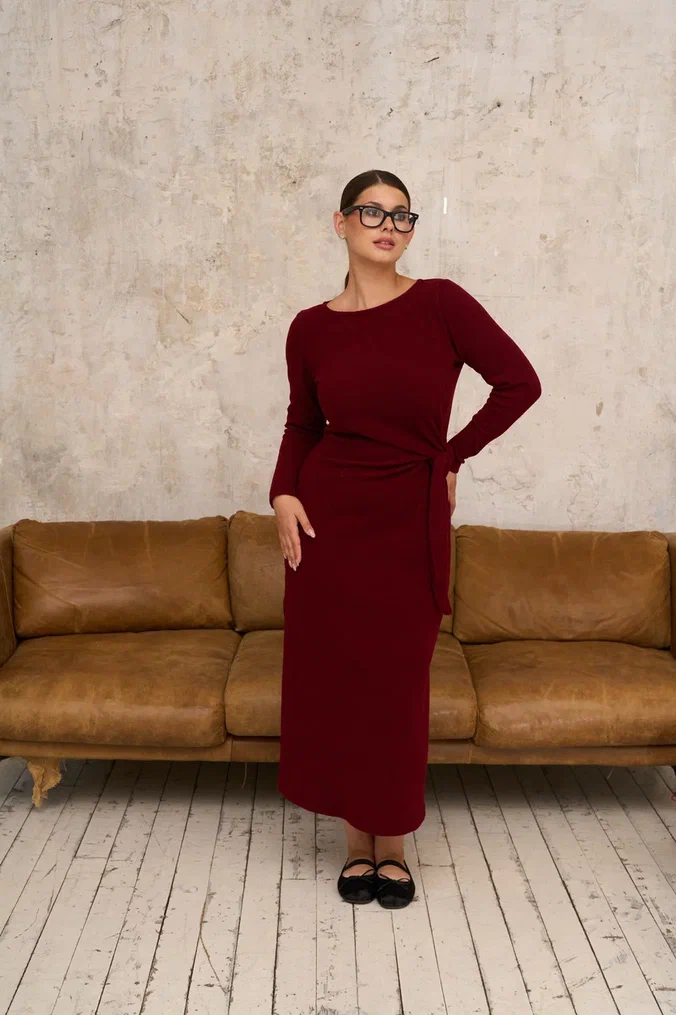 A midi dress pattern with long sleeves. It features a semi-fitted silhouette with waist ties to accentuate your figure. Side seams include slits, and the back has waist darts. The neckline is finished with a stitched facing. This dress is an excellent choice for the office or a business meeting.