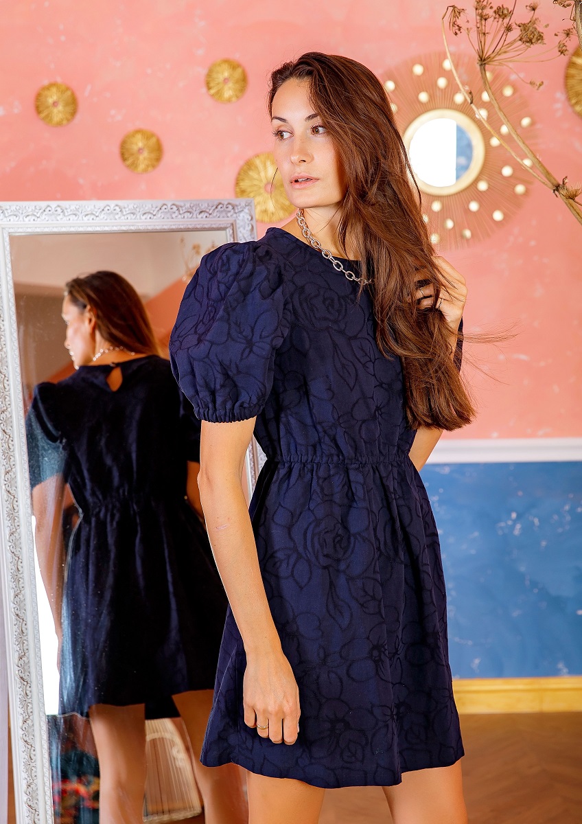 The romantic “Nice” dress features a fitted silhouette with a waist seam. Bodice includes bust darts. Lower part of the dress is voluminous created by pleats at the waistline. The dress has short, puffed set-in sleeves with pleats at the cap. The sleeves have a casing at the hem with elastic tape. There is a shackle closure at the back. The dress length is above the knee.