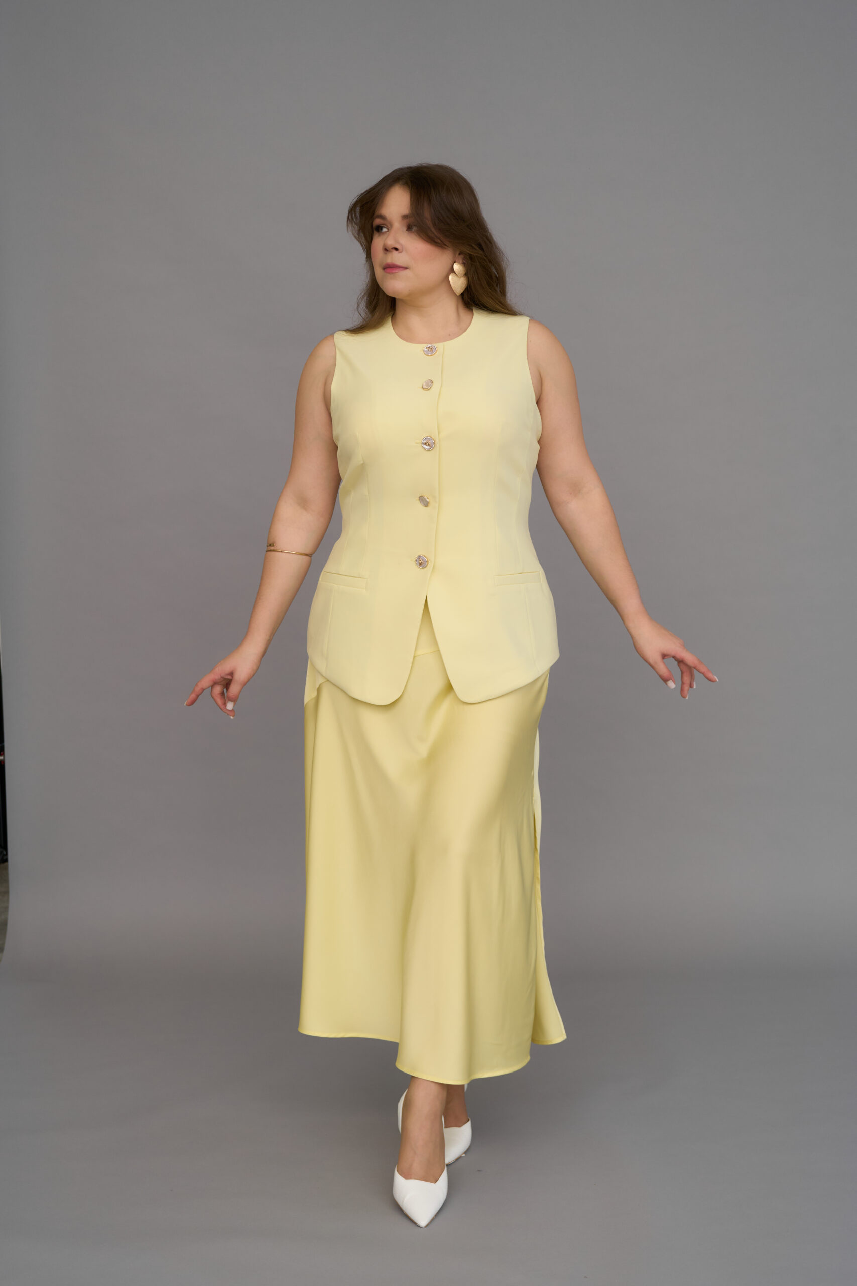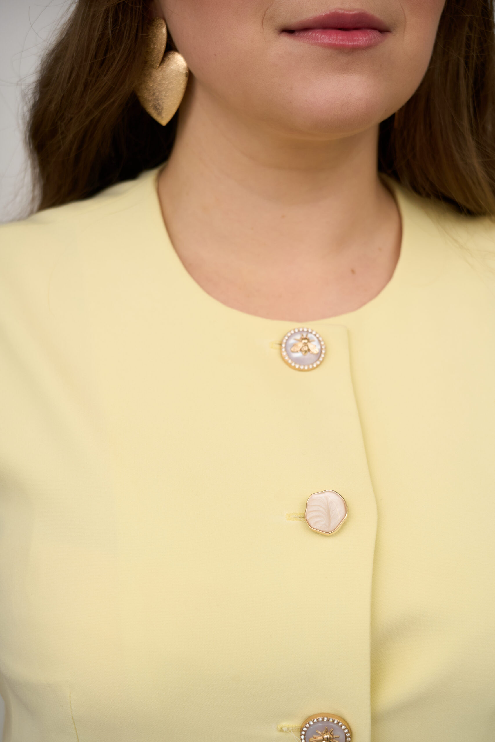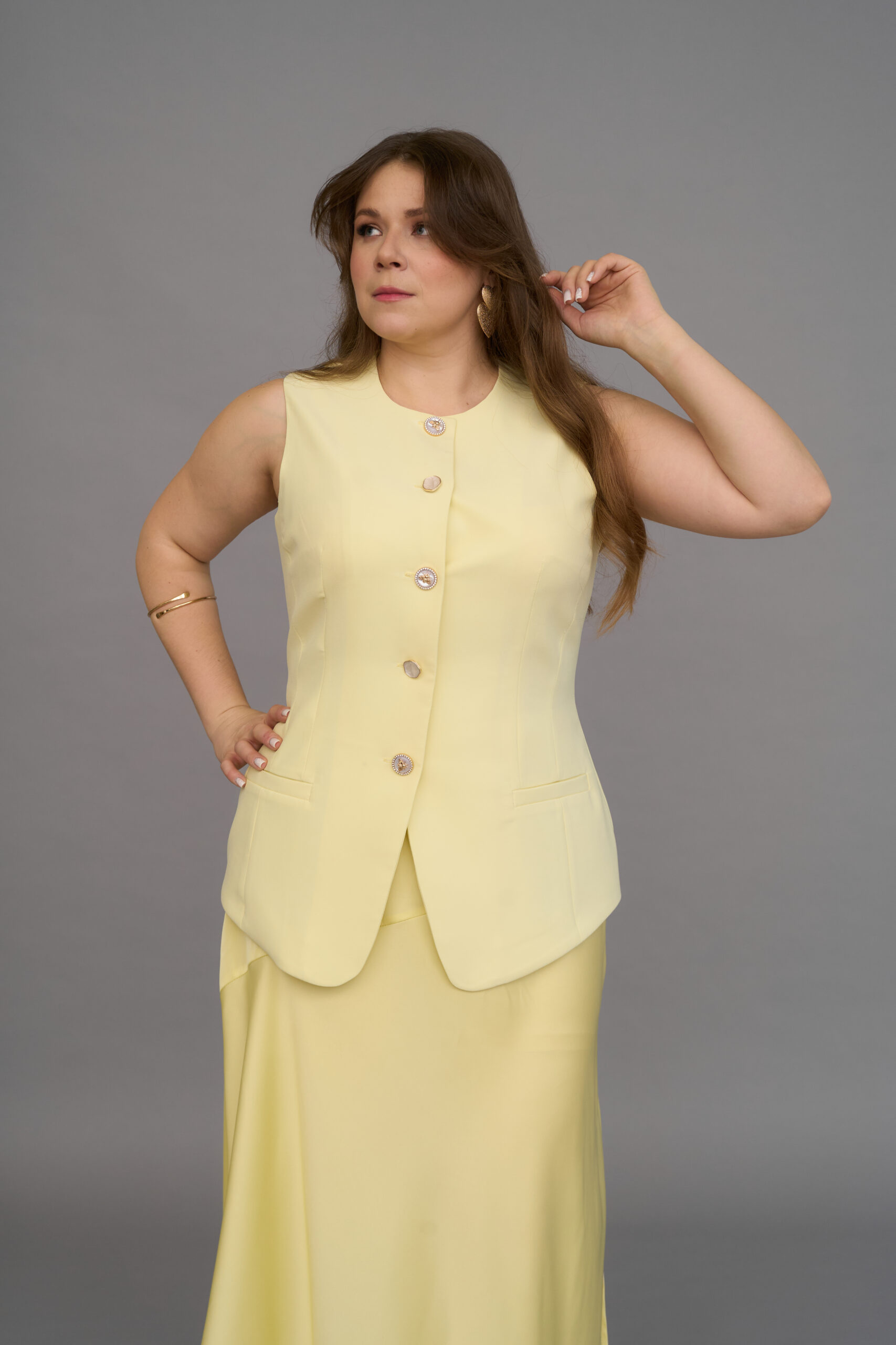 An incredibly feminine and elegant vest with smooth lines. We’ve complemented it with beautiful gold-accented buttons.