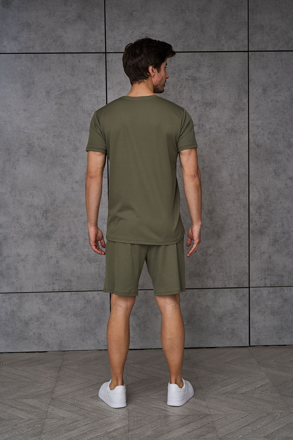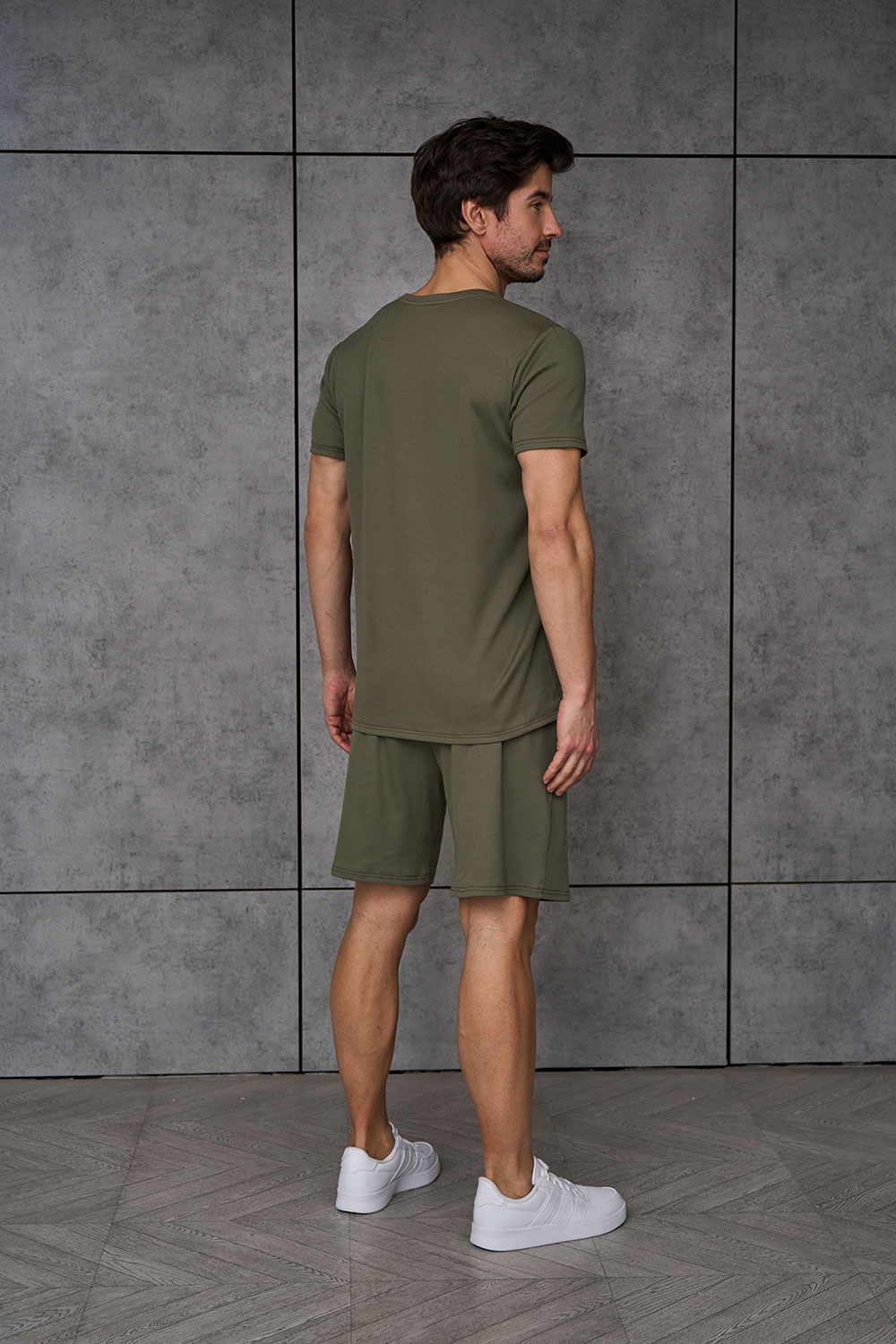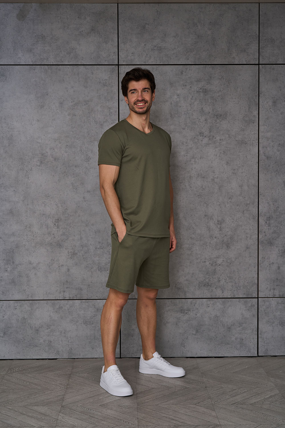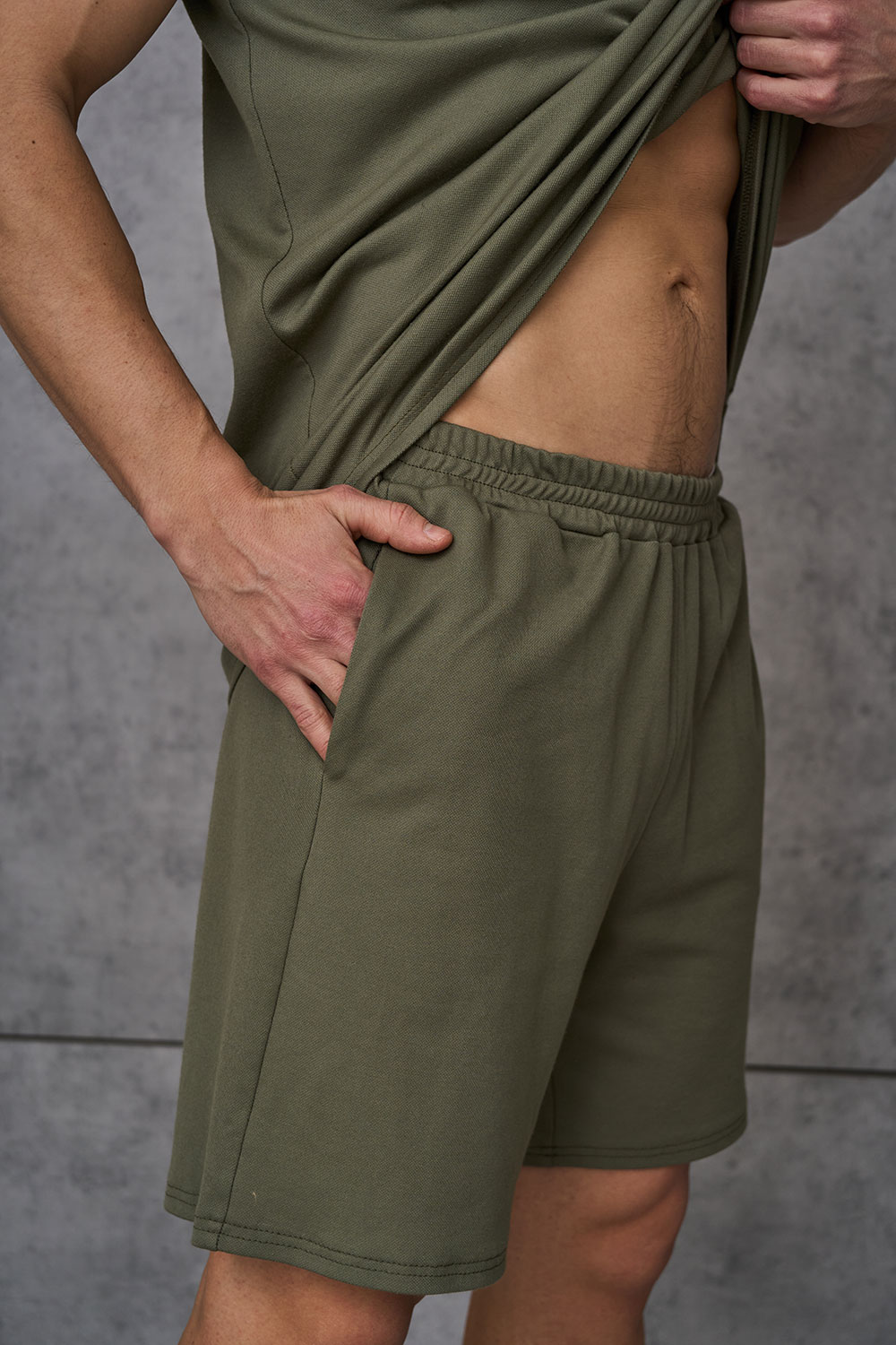 Men’s semi-fitted knit shorts with side seam pockets. An ideal choice for men’s summer sports. Attached waistband with elastic and center eyelets, and a drawstring. Undressed hem with a fixed elastic stitch along the bottom edge.