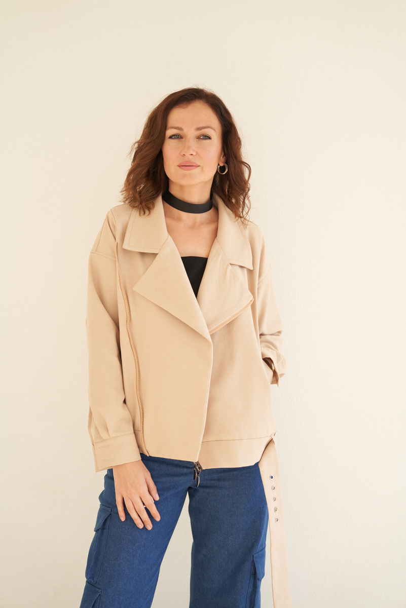 A stylish, loose-fitting biker jacket. Features a classic collar with lapels and welt pockets on the front. Sleeves have cuffs with buttonhole closures. Bottom of the jacket includes a removable belt with a buckle.