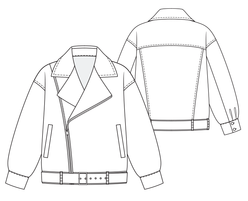 Stylish loose-fitting biker jacket. The jacket has a turn-down collar with lapels. There are welt pockets on the front. Sleeves have buttoned cuffs. Jacket’s bottom features detachable belt with a buckle.