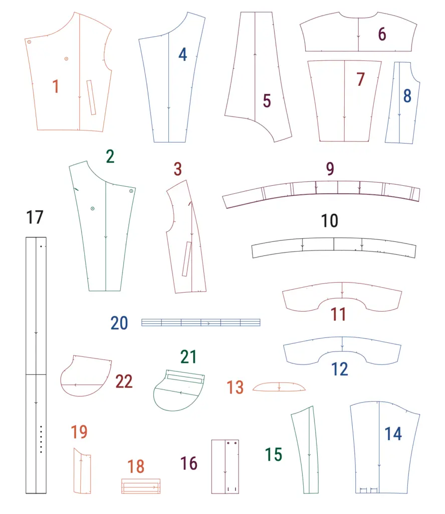 Right front facing (4), left front facing (5), top waistband (9), under waistband (10), top colar (11), under collar (12), colar stand (13), cuffs (16), belt (17), welt (18).