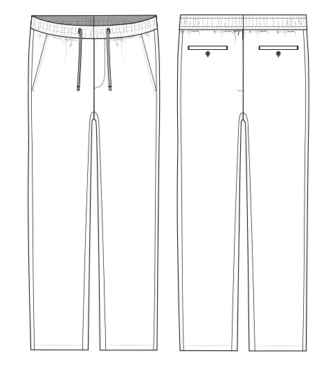 Straight-cut trousers feature an elasticated waistband, grommets and drawstring. There is a fly imitation on the front. There are pockets in the side seams and welt pockets on the back.