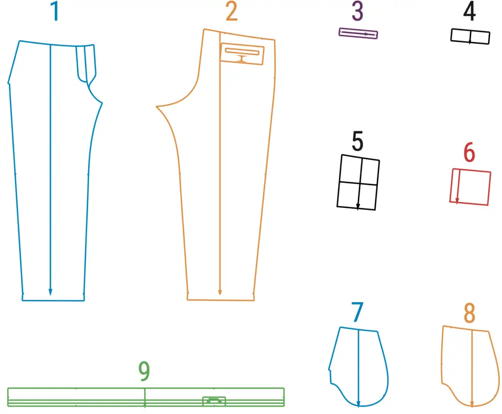 Interface the entrance to the pocket on the front with interfacing tape(1), as well as area for the grommets on the waistband (9). Interface the pocket entrance on the back pieces (2).