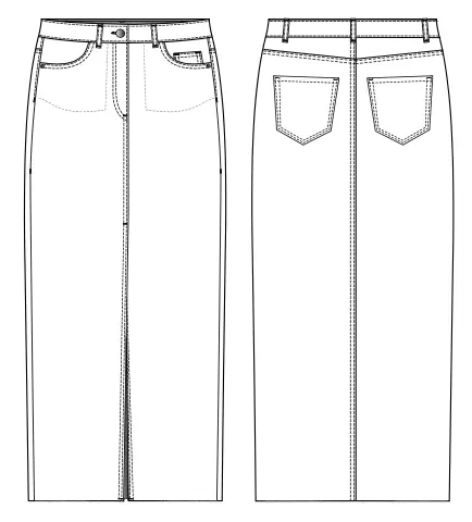 The skirt is maxi length and slightly tapered at the bottom featuring a stitched waistband, a metal zipper, pockets in the side seams and one watch pocket, a cut in the middle seam. The back has detachable yokes and patch pockets. The bottom of the skirt is not hemmed.