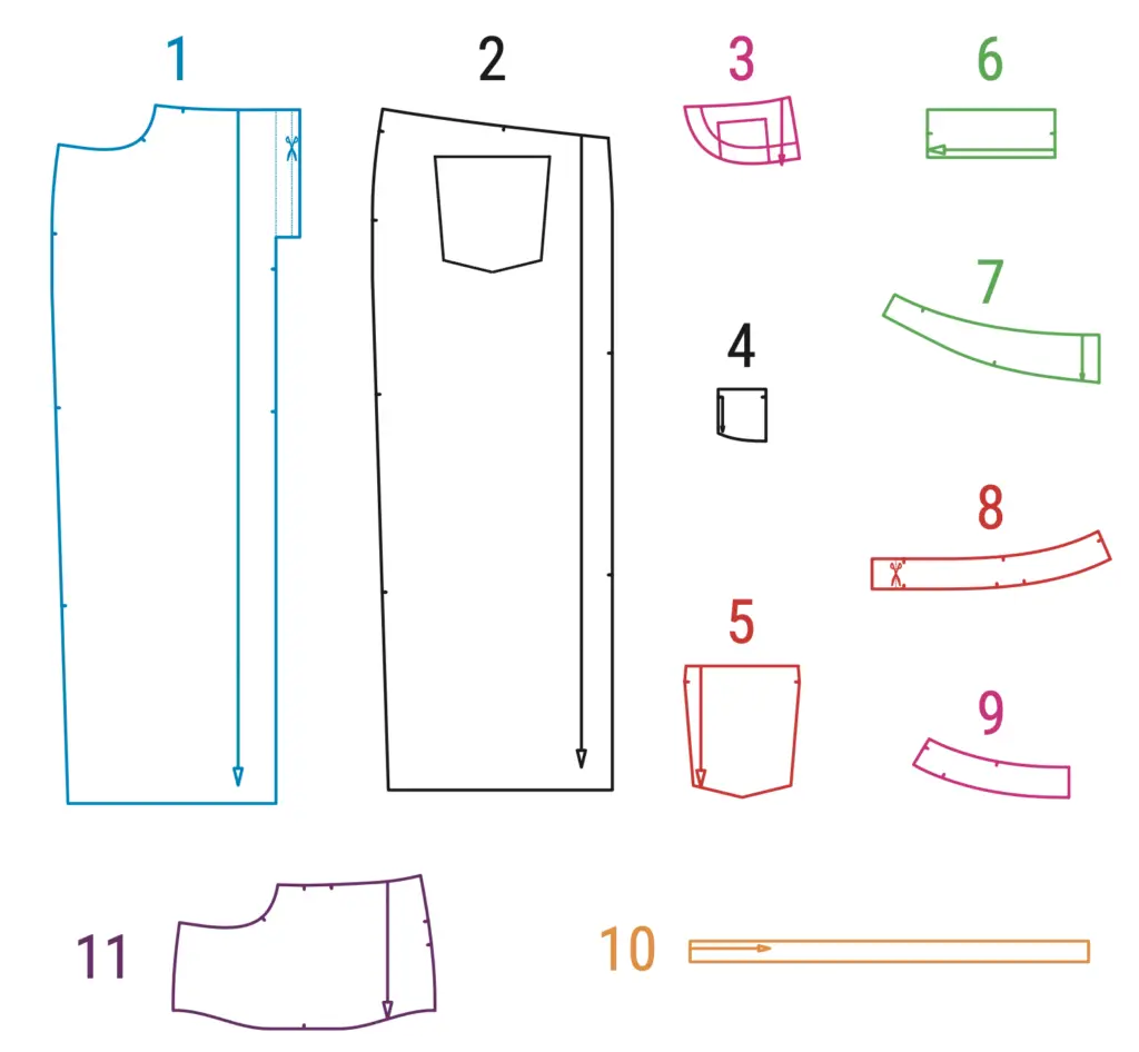 Fly (6), front waistband (8), back waistband (9). Strengthen the pocket entrance with bias cut fusible tape on the pocket bag (11), interface the allowances for the zipper on front pieces (1).